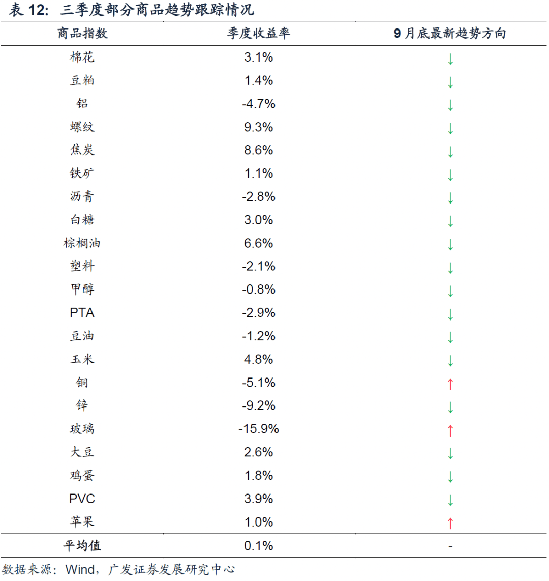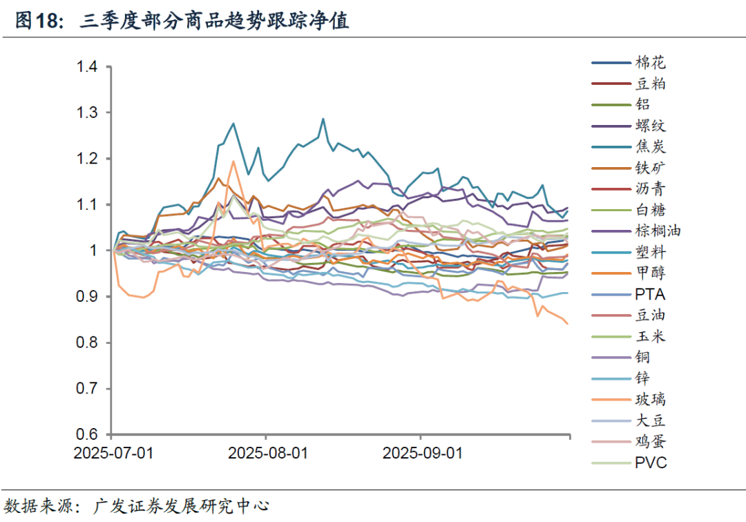 三季度商品趋势跟踪策略在主要品种上平均收益0.1%,业绩较好的品种是螺纹钢、焦炭和棕榈油。