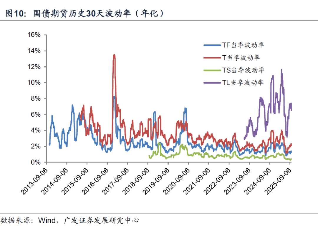 以下是自上市以来,TF、T、TS、TL国债期货的历史30天波动率(年化),三季度长久期国债期货波动率快速反弹。