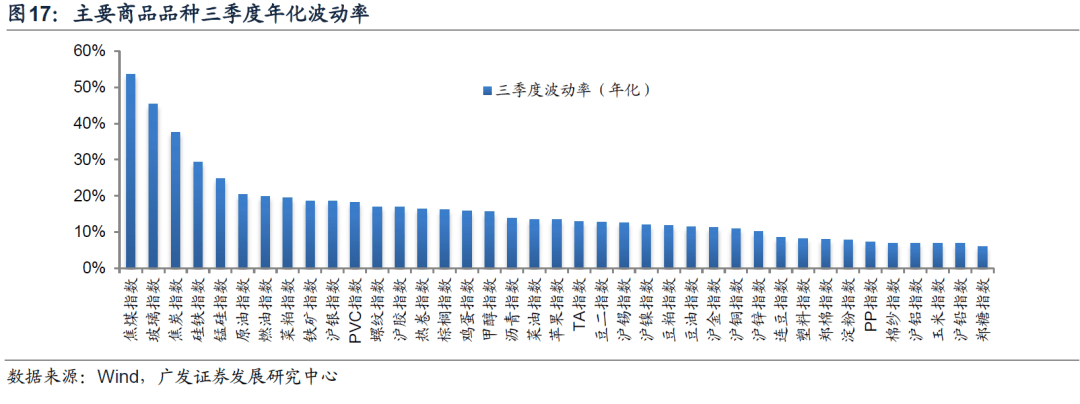 三季度波动率最高的三个品种分别为焦煤、玻璃、焦炭;波动率最低的三个品种分别为白糖、沪铅、玉米。
