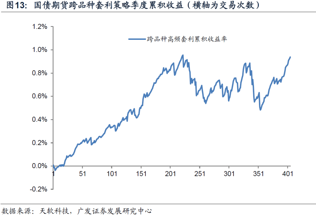 我们选取了5年期与10年期国债期货主力合约作为标的资产回测跨品种套利策略。仍选取分钟级数据,并以10分钟为历史滑动平均的计算窗口,当价差大(小)于历史均值加(减)一个标准差,便通过做空(多)五年期国债期货并做多(空)十年期国债期货来做空(多)价差。若价差回复到均值水平便平仓。根据我们2016年4月的报告,我们选取5分钟作为滑动平均的计算窗口,得到本季度累积收益曲线如下: