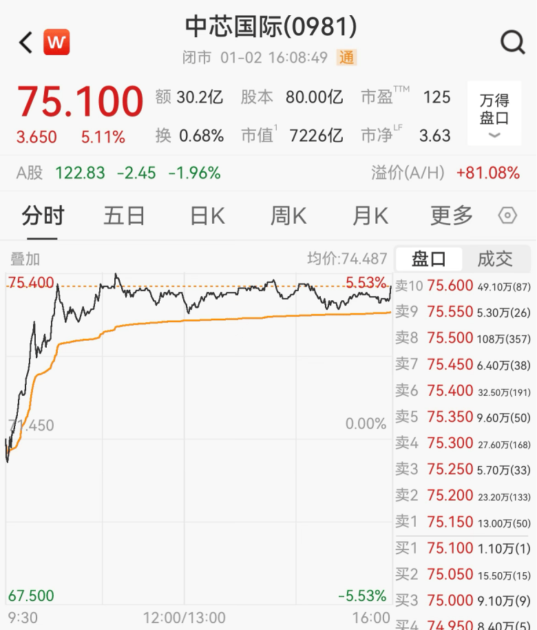 二级市场方面,1月2日,中芯国际H股开盘高走,截至收盘大涨5.11%,报75.1港元/股。