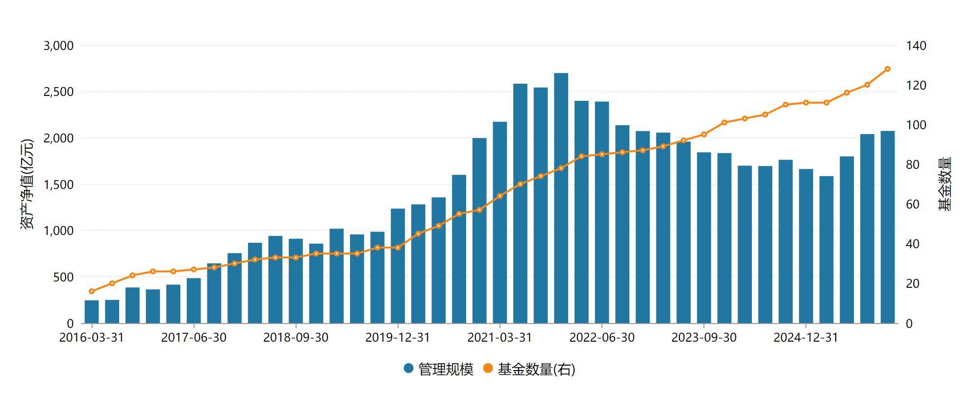 公开数据显示,东方红资管的衰退并非短期周期波动,而是呈现结构性特征。作为业内首家获得公募牌照的券商资管,东方红资管曾“风光无两”——2017年在偏股主动型基金TOP10榜单中占据6席,2021年管理规模攀升至近2700亿元的峰值,行业排名稳居前20位。