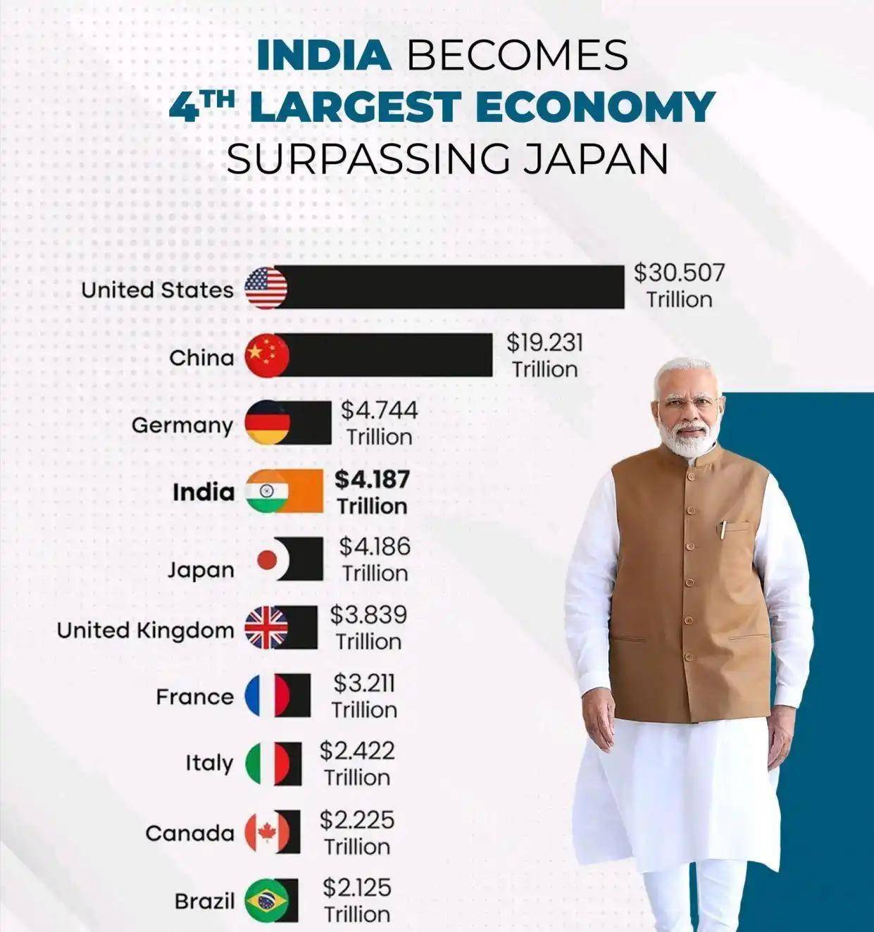 印度官方数据显示,2025年印度国内生产总值达到4.18万亿美元,确实略微超过了日本的4.186万亿美元。这一历史性变化使印度成为世界第四大经济体,仅次于美国、中国和德国。