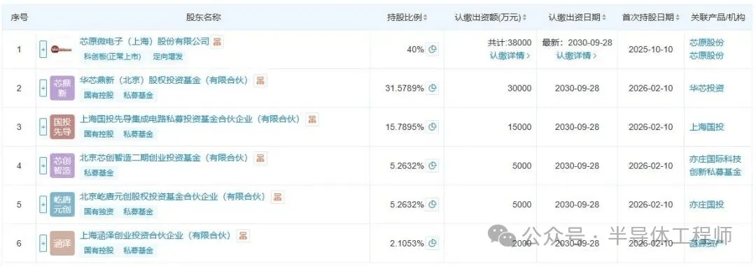 从上图可以看出,芯原股份、华芯鼎新、上海国投先导依次位列前三大股东,认缴出资额分别为3.8亿元、3亿元和1.5亿元,对应持股比例达40%、31.58%和15.79%。