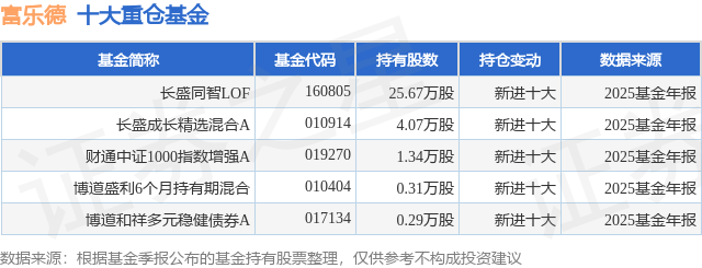 根据2025基金年报公募基金重仓股数据,重仓该股的公募基金共5家,其中持有数量最多的公募基金为长盛基金的长盛同智LOF。长盛同智LOF目前规模为3.22亿元,最新净值0.7576(4月16日),较上一交易日上涨0.26%,近一年上涨17.88%。该公募基金现任基金经理为钱文礼。钱文礼在任的基金产品包括:长盛成长龙头混合A,管理时间为2021年4月21日至今,期间收益率为-43.17%;