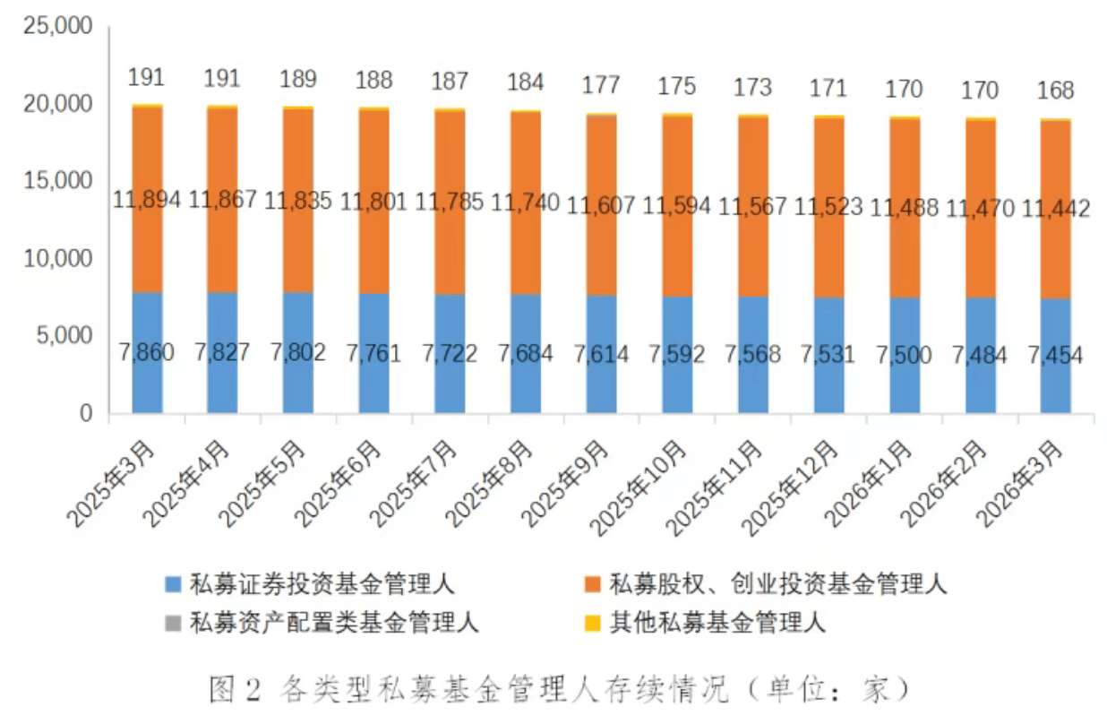 具体来看,截至3月末,私募证券投资基金管理人7454家;私募股权、创业投资基金管理人11442家;私募资产配置类基金管理人3家;其他私募投资基金管理人168家。