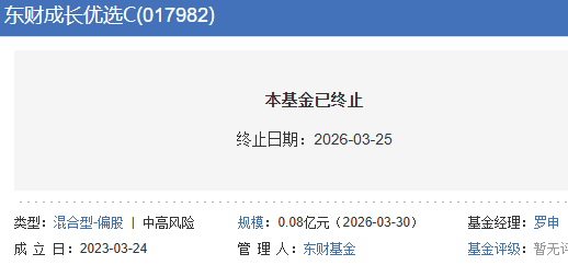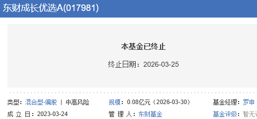 根据基金管理人于2026年3月25日发布的《关于西藏东财成长优选混合型发起式证券投资基金发生基金合同终止情形及基金财产清算的公告》,该基金基金合同生效日为2023年3月24日,基金合同生效之日起满三年后的对应日(该对应日如为非工作日,则自动顺延至下一个工作日)为2026年3月24日。截至2026年3月24日日终,该基金基金资产净值低于2亿元人民币,触发了基金合同约定的自动终止情形。基金管理人将按照基金合同的约定履行基金财产清算程序,无须召开基金份额持有人大会。