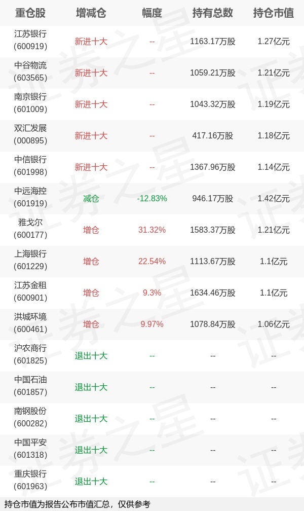 2026-04-23南宫28官网,南宫28官方网站,南宫28APP下载证券之星消息,4月22日富国基金旗下徐幼华 方旻管理的富国中证红利指数增强型基金公布一季报,近1年净值增长率13.53%。与上一季度相比,该基金前十大重仓股新增江苏银行,中谷物流,南京银行,双汇发展,中信银行;其中中远海控持仓占比2.45%,为该基金第一大重仓股;沪农商行,中国石油,南钢股份,中国平安,重庆银行等退出前十大重仓股;详细数据如下: